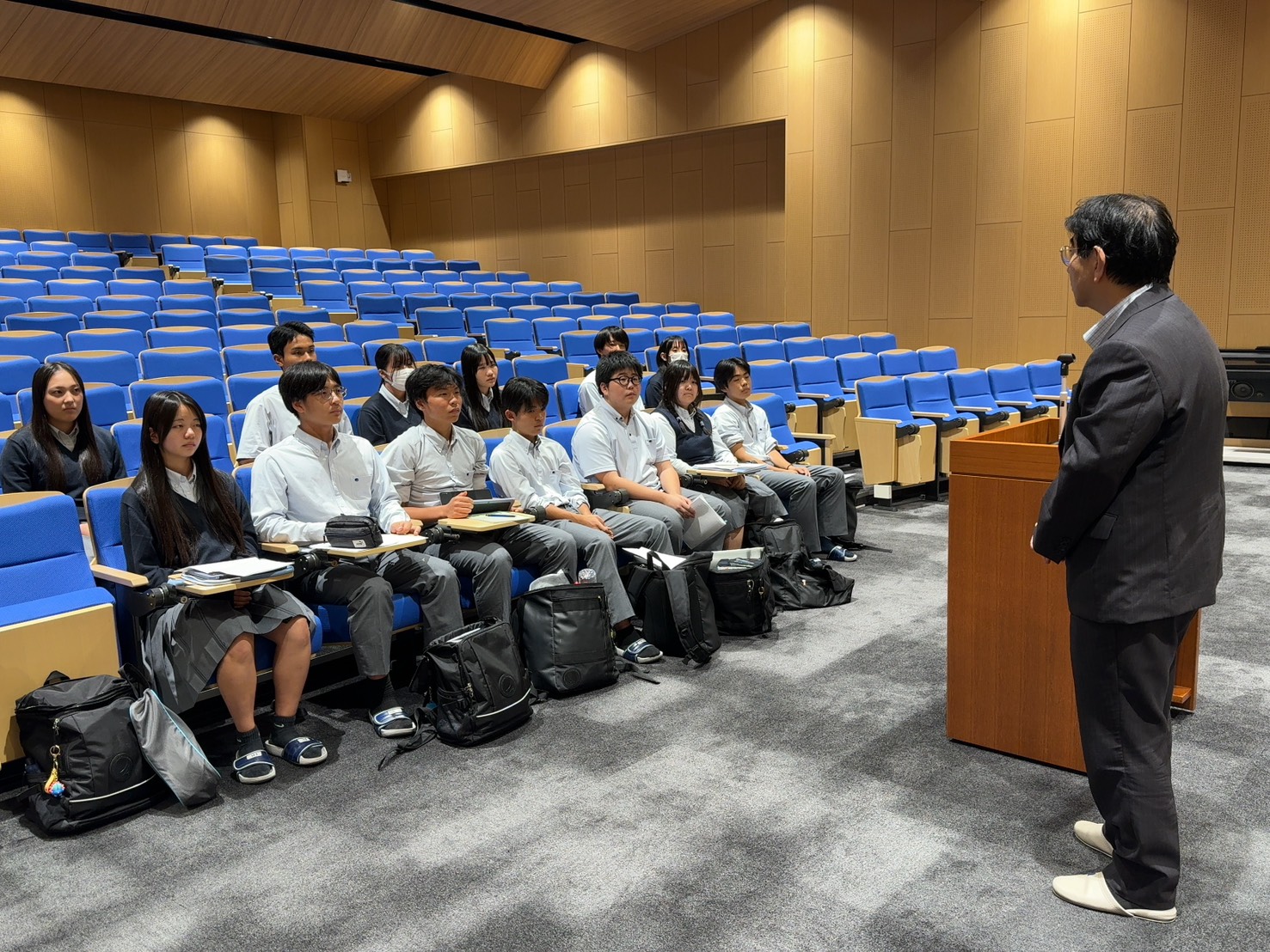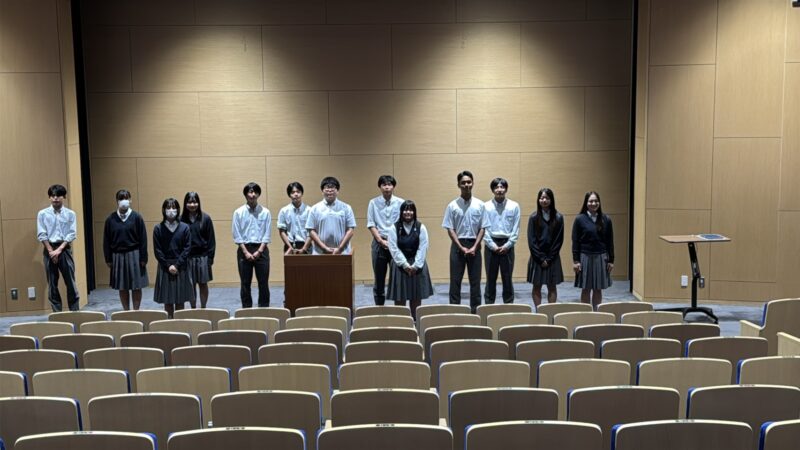 協創ホールに集った十数名の生徒たち。彼らはクラス内選考で代表に選ばれたスピーカーのみなさんです。高校1年生は来月17日に『KPC+Grade1』と題してコンテストを予定しています。この日は当日にも審査員として参加していただく安田女子大学の難波先生をお迎えし、スピーカーとしての心がまえを学びました。