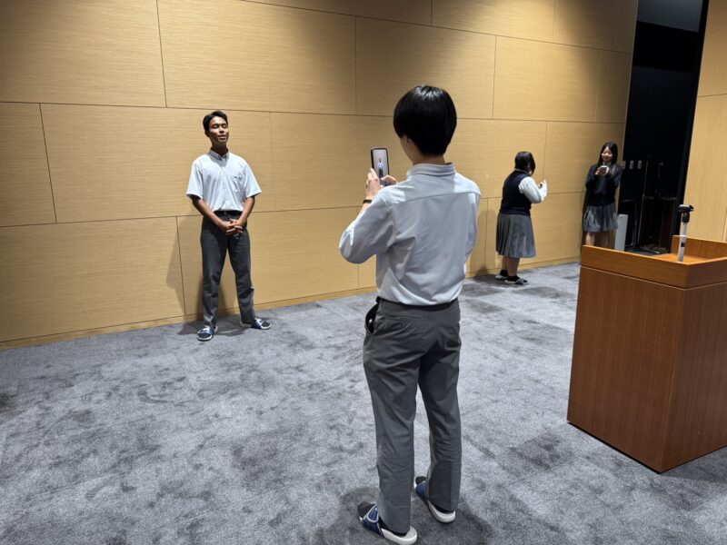 最初に「スピーカーとして前に立つのであれば、自分以外の人物になったつもり取り組んでみよう」というお話を受けました。それぞれが理想とするスピーカーを連想したうえで、基本であるあいさつから練習をしました。また、「間」を意識することや「声の高低」を意識することで、人に伝わる話し方とはどのようなものなのか学ぶことができていました。「みなさん、こんにちは」や「Hello、everyone」という短いフレーズをペアやグループになってお互いに撮影しながら何度も練習し、最後は一人ずつ難波先生の前で練習の成果を見せました。視線や声の大きさ、登壇したときの手の位置など少し変えただけで場の雰囲気をつかむことができるという学びを得て、スピーカーとしての心構えを身につけたようです。