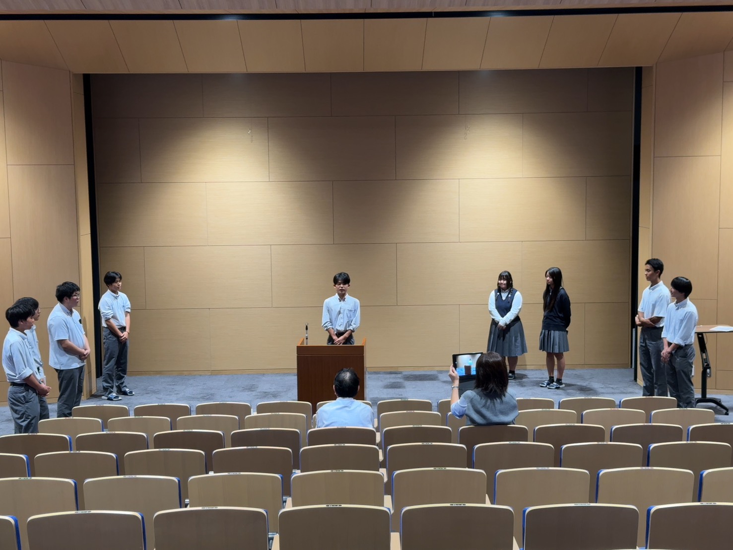 協創ホールに集った十数名の生徒たち。彼らはクラス内選考で代表に選ばれたスピーカーのみなさんです。高校1年生は来月17日に『KPC+Grade1』と題してコンテストを予定しています。この日は当日にも審査員として参加していただく安田女子大学の難波先生をお迎えし、スピーカーとしての心がまえを学びました。