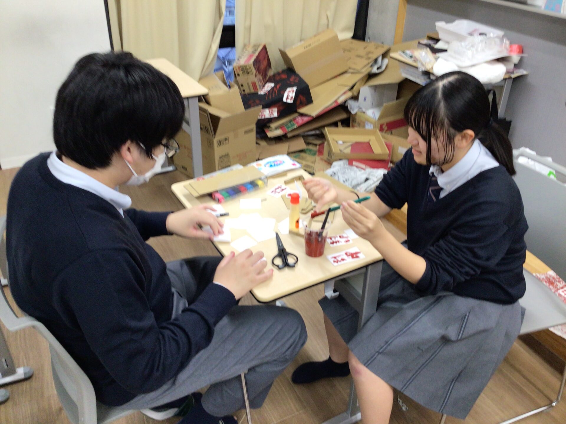 本日、高校2年生は記述模試を受験しました。今日は理科、公民、国語、英語がありました。生徒たちはクタクタになっていましたが、放課後にお楽しみの時間が待っていました。文化祭準備です。