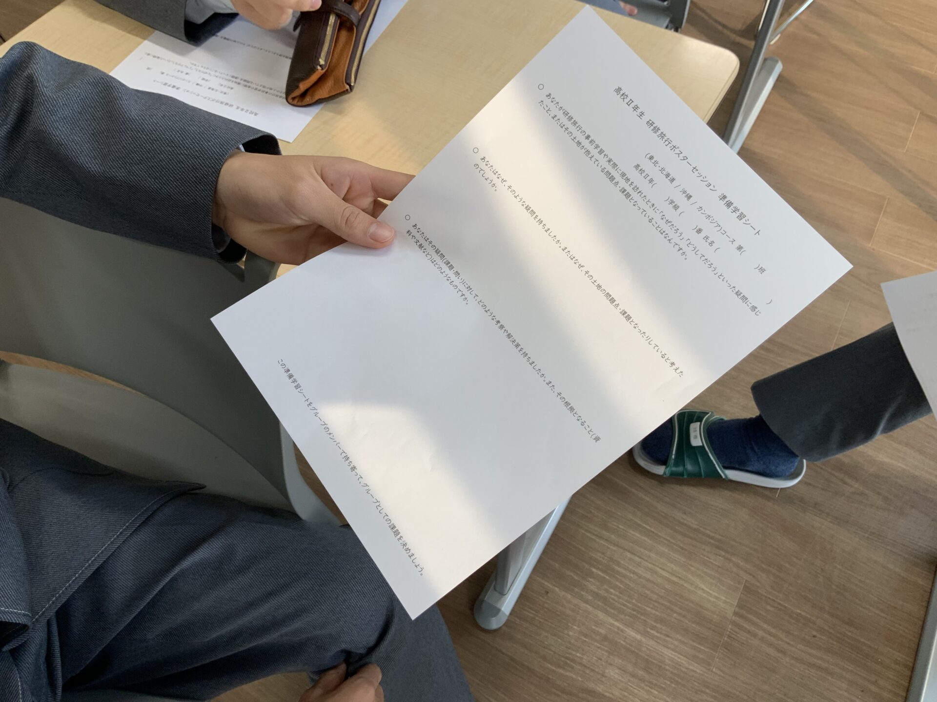まずは、それぞれの生徒が研修旅行を通じて感じたことを振り返り、班ごとにポスターの原案を考えていきます。