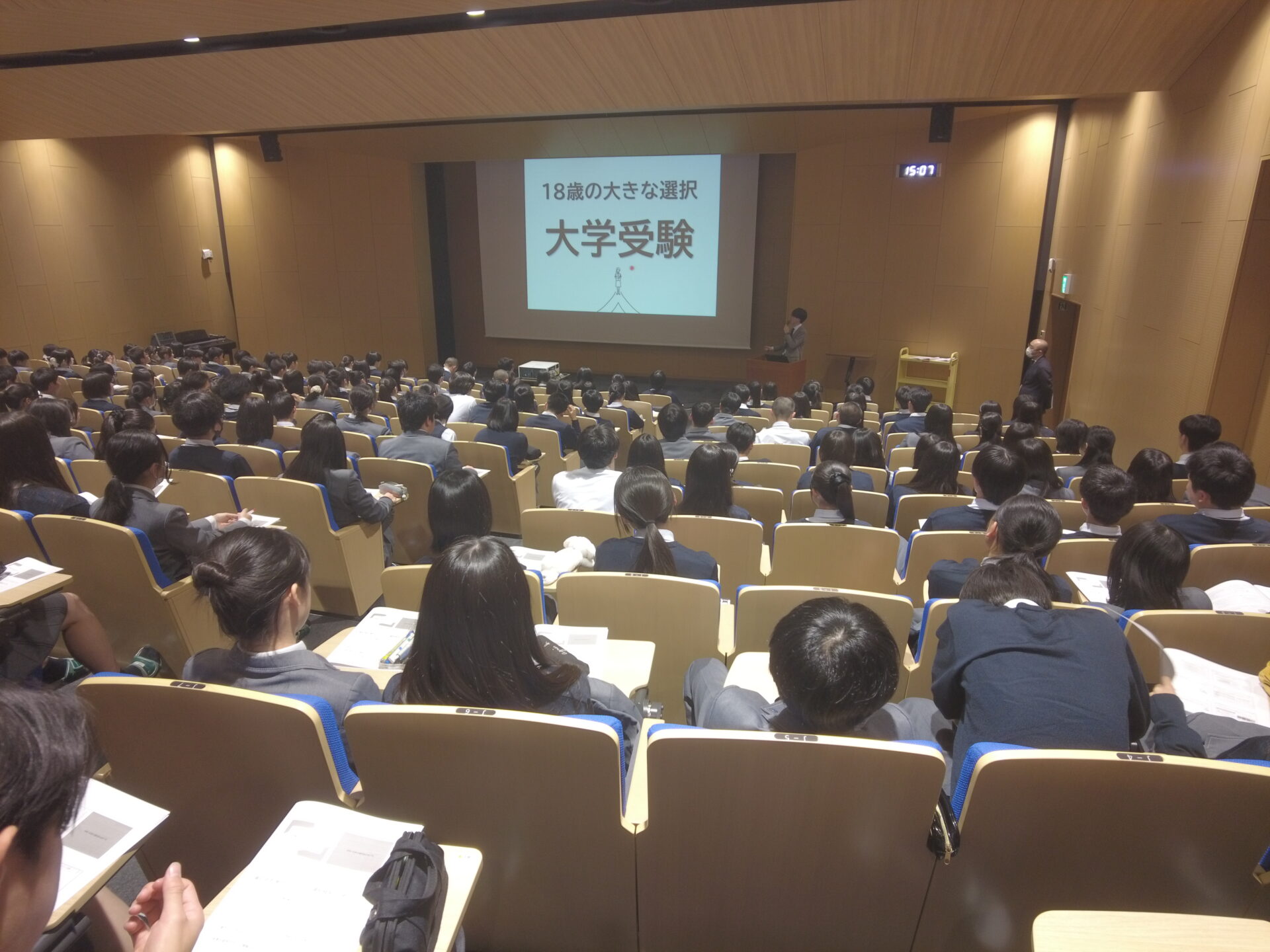 本日の高校Ⅱ年生のLHRは協創ホールに集まっての進路内容の学年集会でした。 進路支援部長より近年の大学入試の状況、推薦条件の再確認、学部学科の選択の仕方、今高Ⅱでやるべきこと、などが話されました。