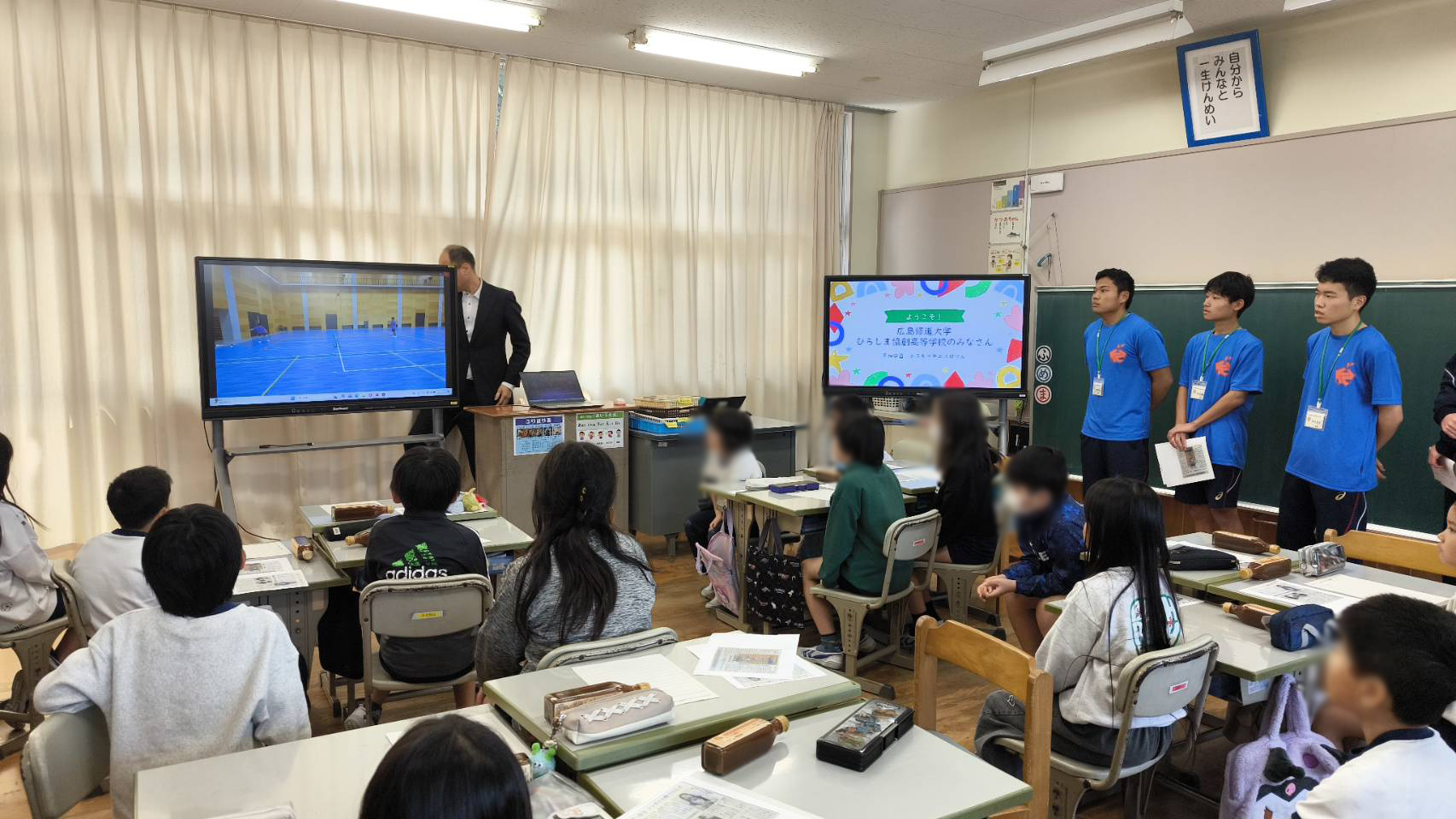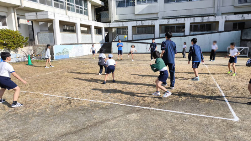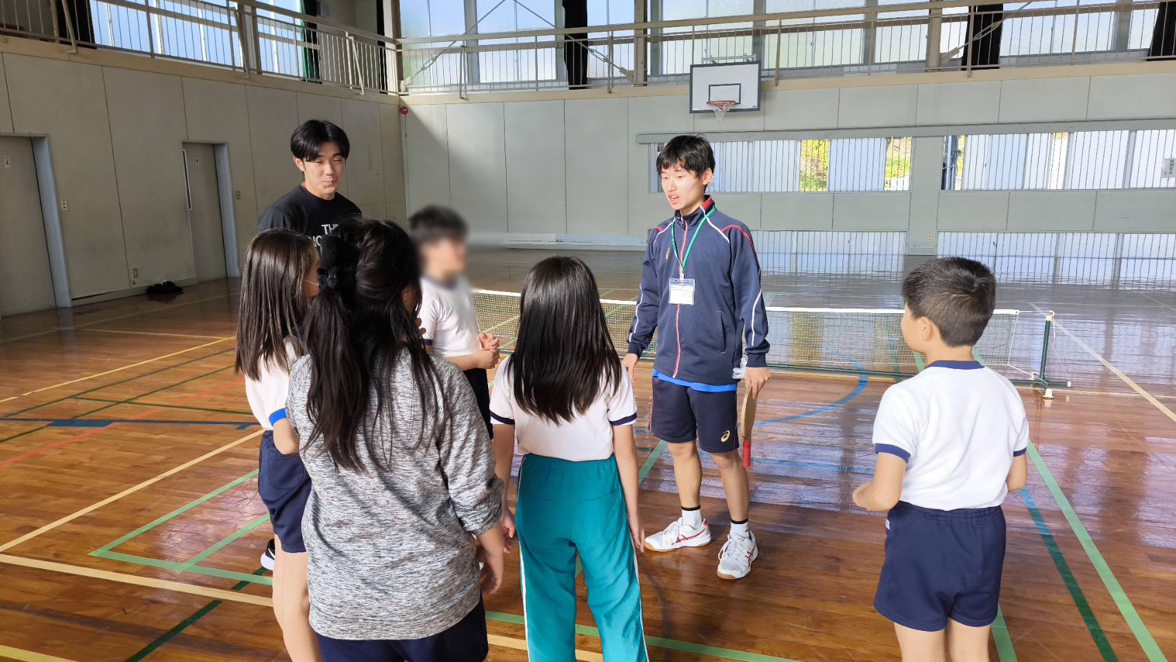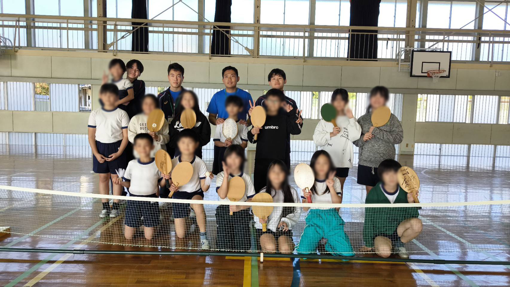 12月18日、新幹線、特急、西九州新幹線、バスを乗り継いで、外海黒崎小学校に到着。小学校の前には水平線が広がっていました。到着と同時に4名の生徒は、体育館内に3面のエスキーテニスコート作りました。教室に移動し、エスキーテニスと平和、競技ルール、広島原爆と小学校給食に関する講義を子どもたちに行いました。給食を子どもたちと食べた後、昼休みにはドッジボールを楽しみました。午後からはエスキーテニスの体験会を実施しました。子どもたちは木製のラケットと羽の付いたボールに戸惑いながらも、エスキーテニスを楽しんでくれました。生徒達が帰る際には、子どもたちが正門で待ってくれていて、