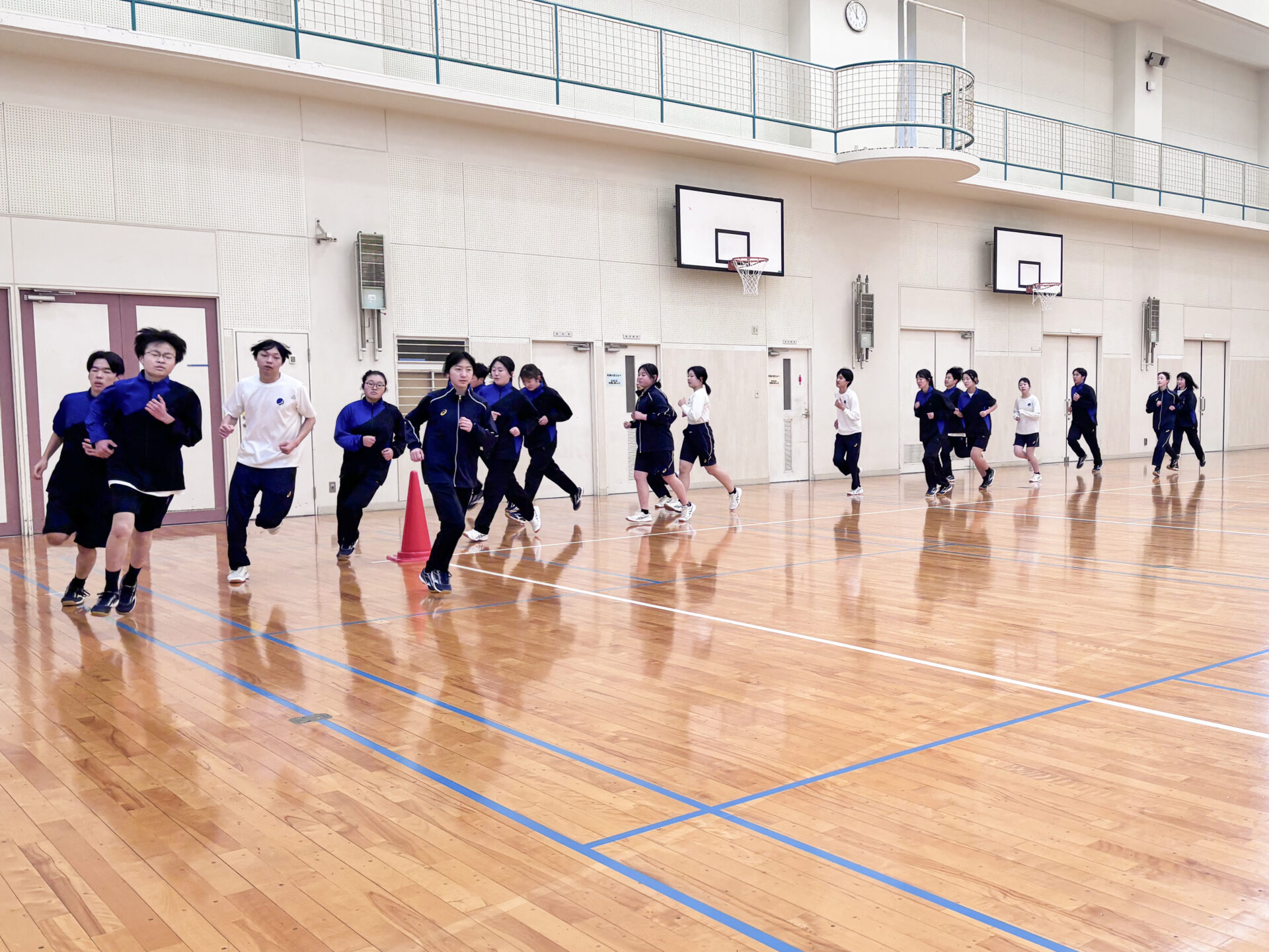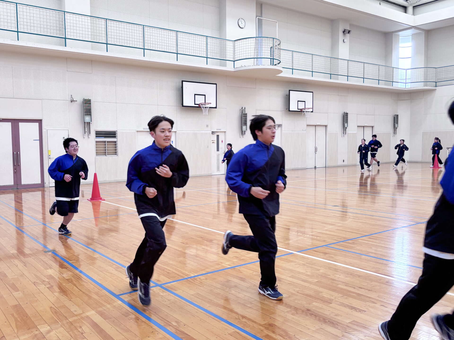 今日は高校一年生の体育で、持久走を行いました。今回は屋外ではなく、体育館内のトラックを周回して走りました。天候に左右されず、安全に取り組めるのが体育館走の良いところです。