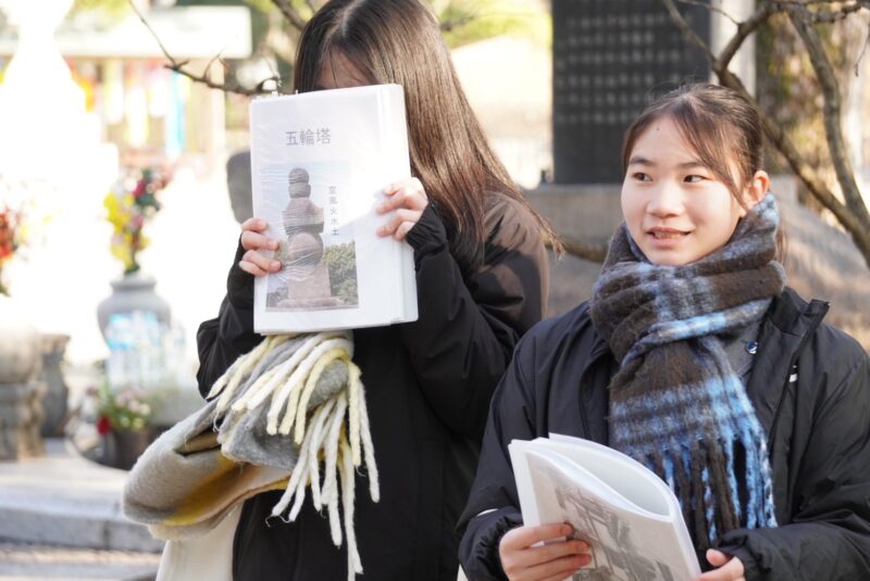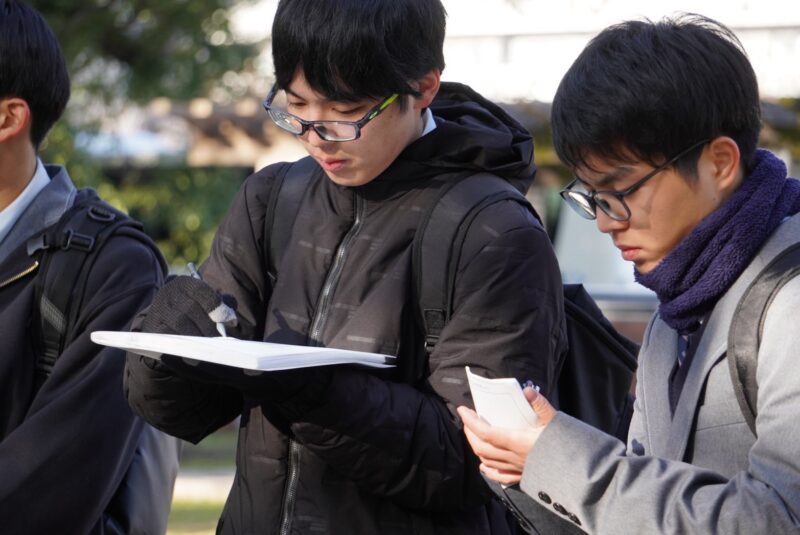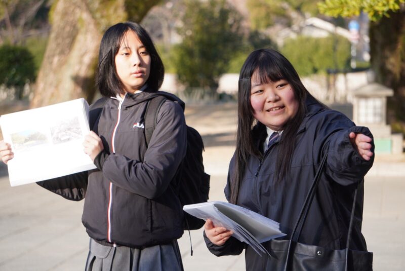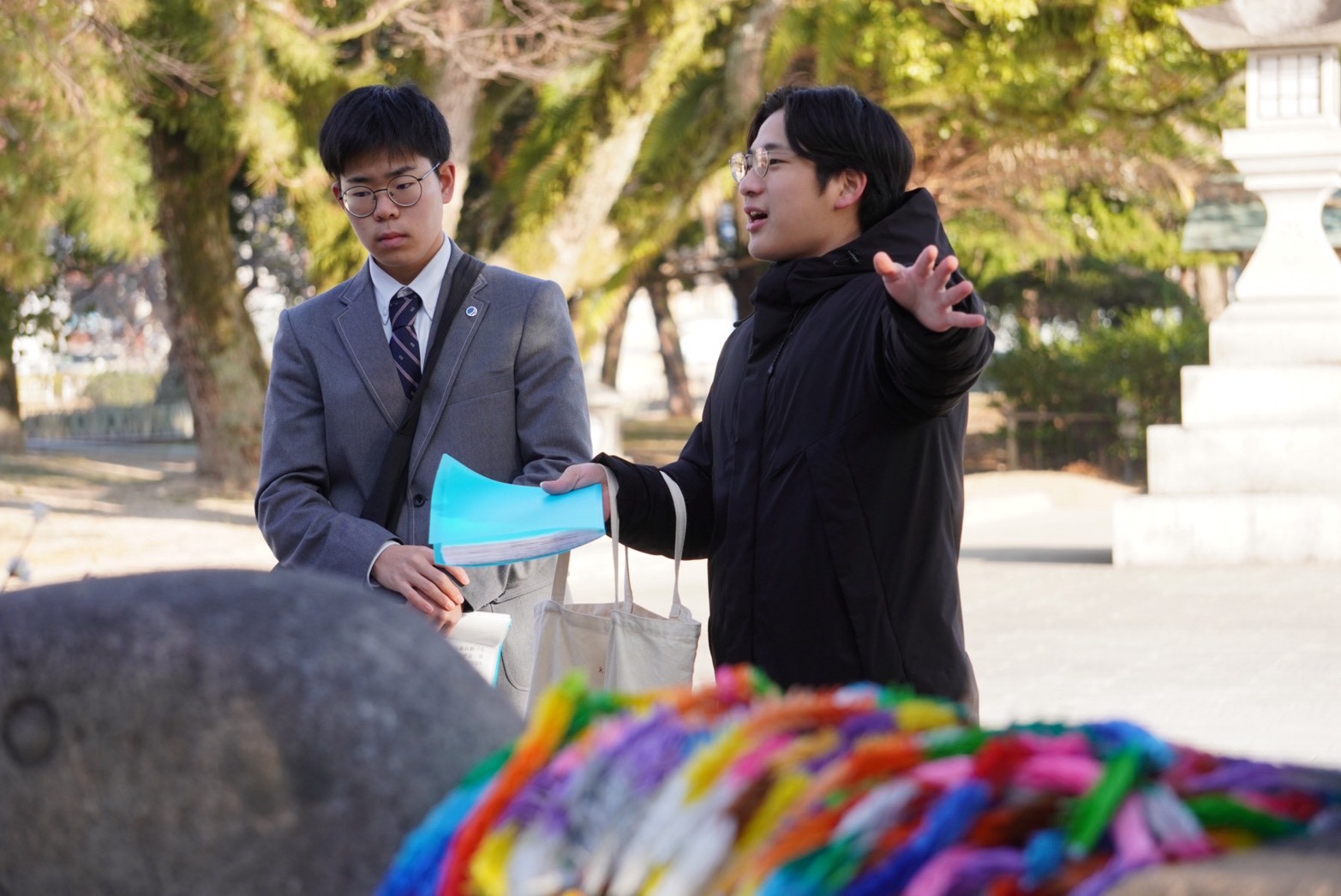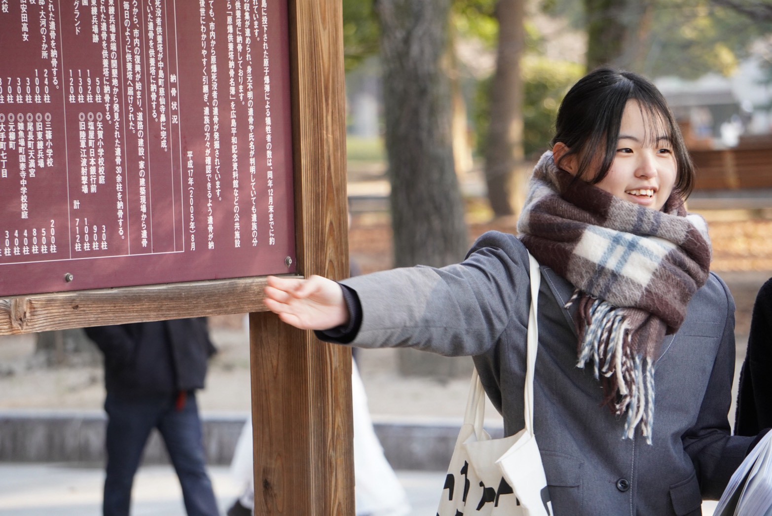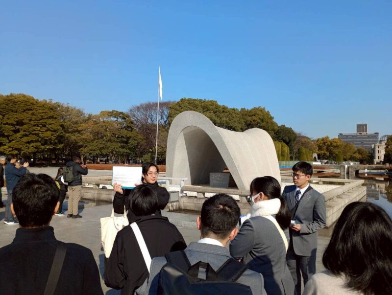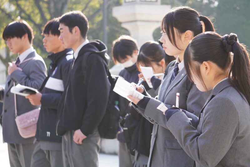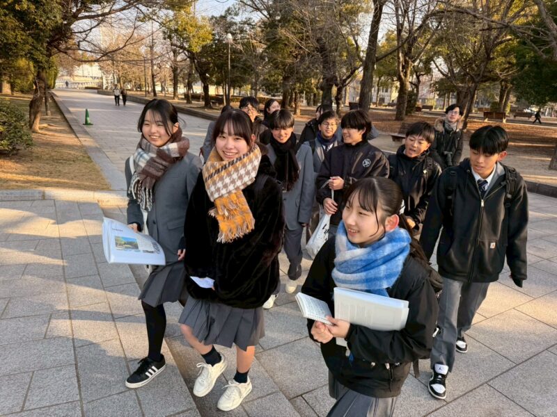 晴天のもと、共通テスト会場に向かう3学年に念を送りつつ、1学年は平和公園にて平和についてさらに学びと願いを深める一日です。沖縄戦や被曝ピアノに次いで、集大成である学年最後の平和学習は、立候補してくれた生徒たちの先導による碑めぐり・ガイドツアーです。生徒が同じ学校の仲間を案内するこの試みに、公園内を訪問されていた方々に「素晴らしいですね」「横で聞き入ってしまいました」とお声がけを頂き、誇らしく思いました。学んできたことを伝えようと熱が入るガイド役の生徒、静かに聞き入る生徒、質問する生徒、それぞれが原爆資料館の見学と併せて公園の碑をめぐりながら平和について考える良い機会になったことと思います。