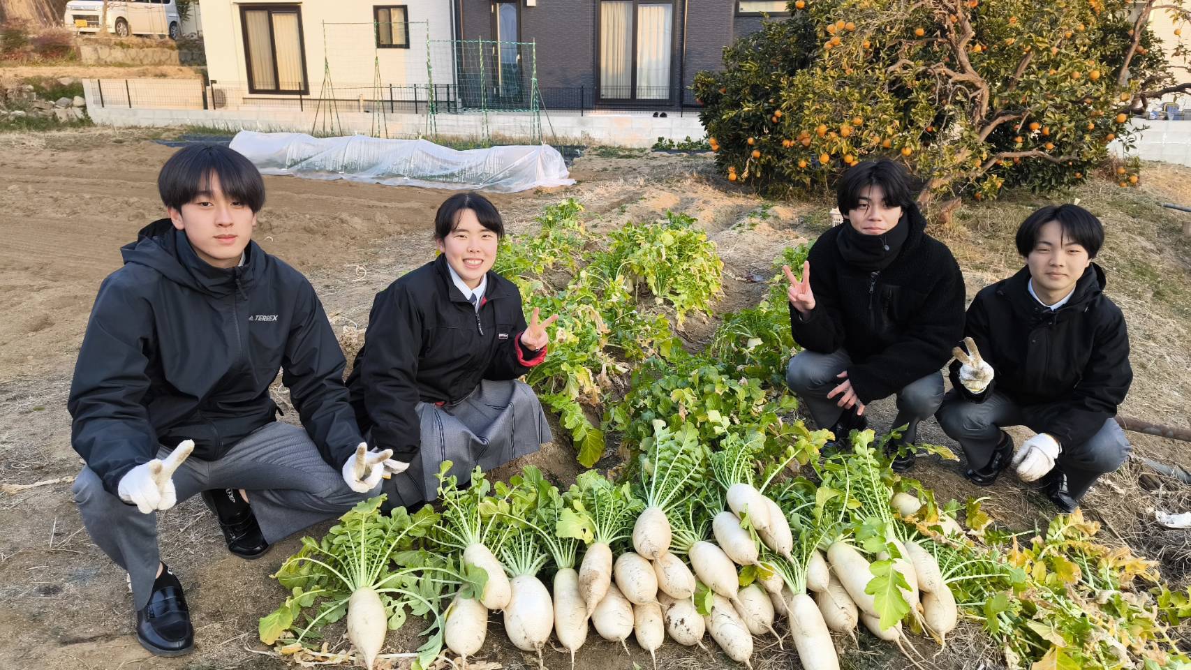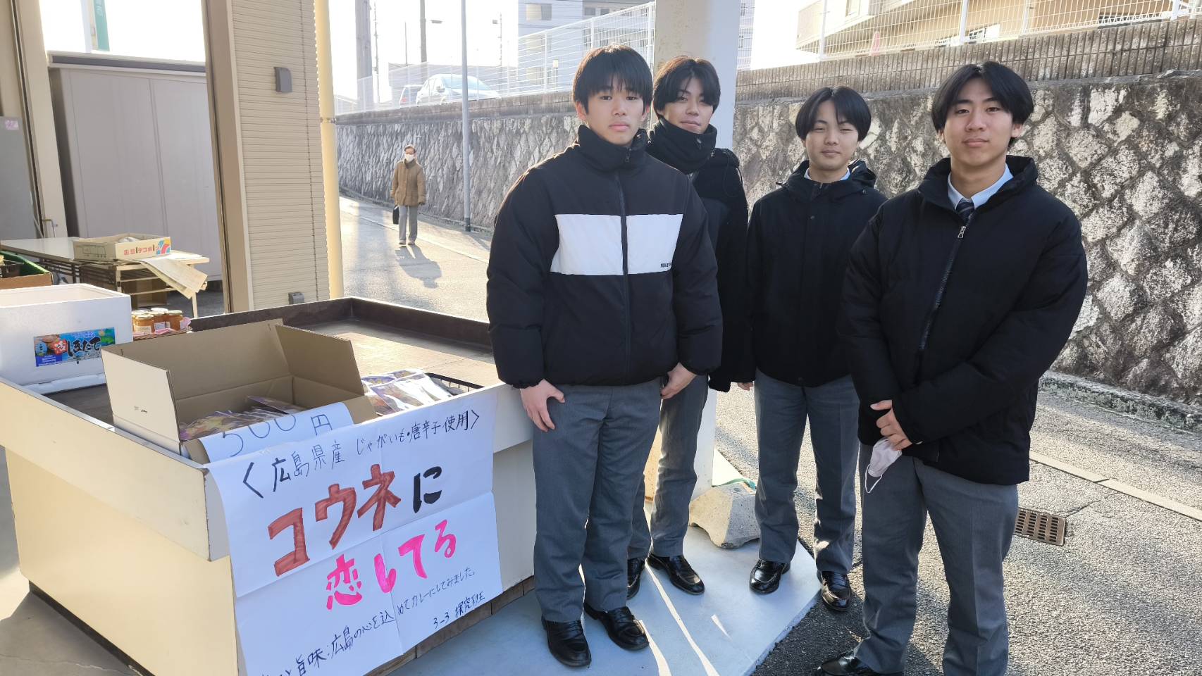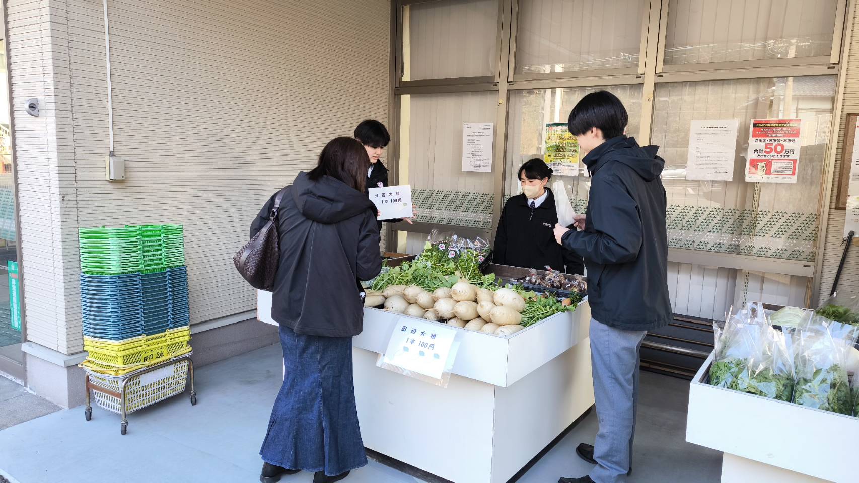 と生徒たちが大声でお客さんにアピールした結果、田辺ダイコン23本、コウネカレー17袋を売り上げることができました。7名生徒たちは、4月から大学への進学が決定しています。今回の井口朝市での販売活動の経験を大学での学業に活かしてくれることでしょう。
