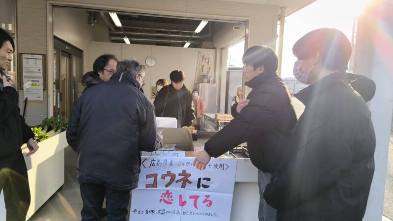 2月2日(月)7時30分、3年生7名は園芸教室に集合し、朝市の準備を始めました。寒空の下、4名の生徒は農場で田辺ダイコン30本を収穫しました。凍える手で土を落とし、枯死葉を取り除き、農作物を商品に変化させました。また、3名の生徒は牛のコウネ肉、安芸津町産のジャガイモ、三原町産の米粉を用いたカレー、本校産のトウガラシを用いて完成させたレトルトカレー(商品名:コウネに恋してる)30袋の包装作業を行いました。