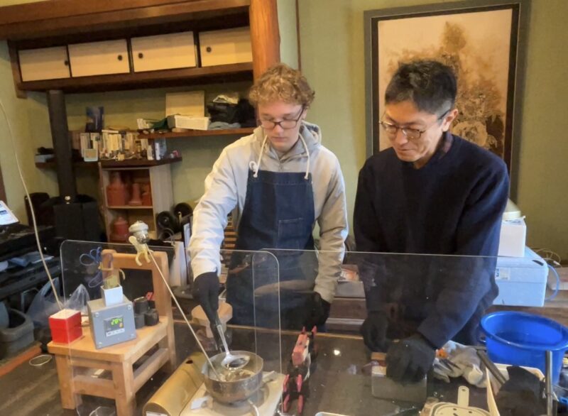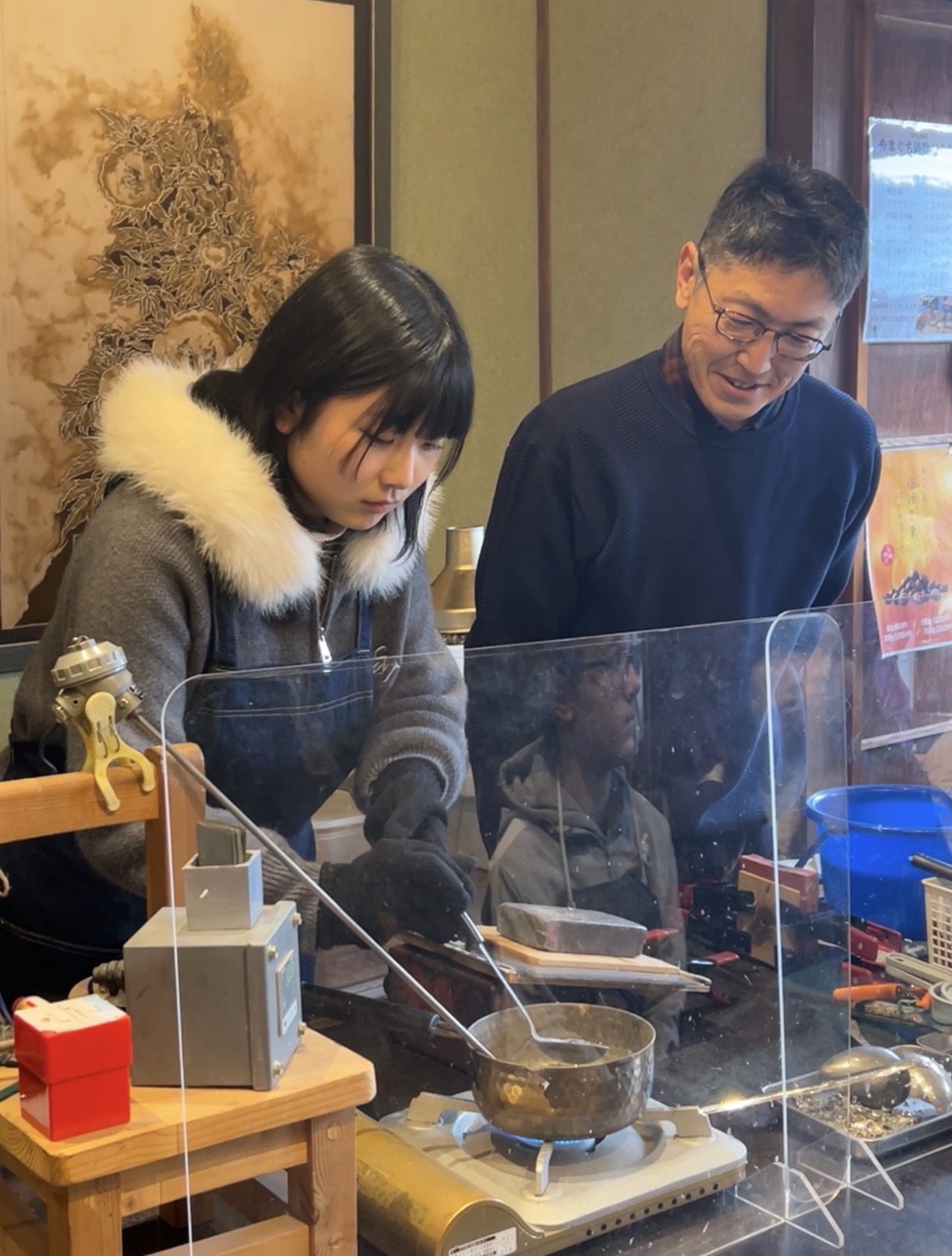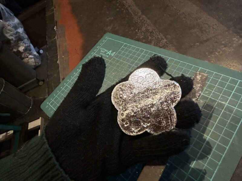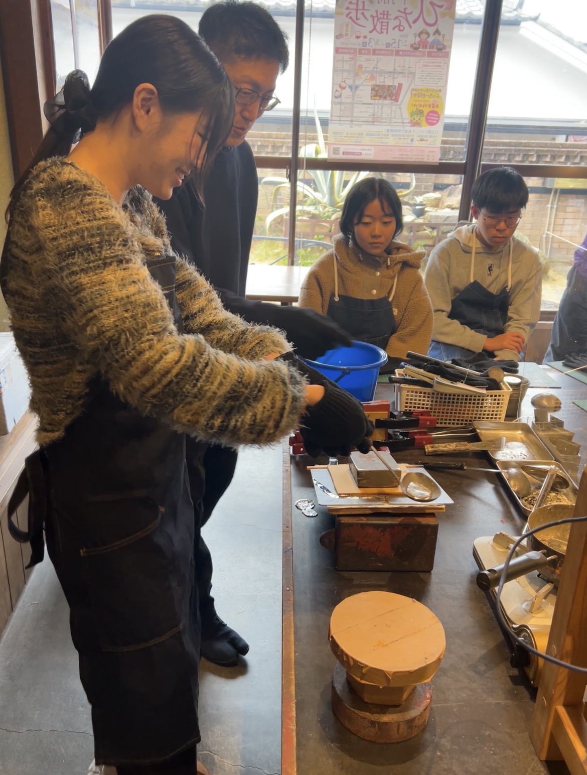 今回インターアクト部は、いつもお世話になっている広島西ロータリークラブの方々との交流会ということで、山口県防府市にいってきました。防府市は鋳物産業がさかんだそうで、鋳物づくりを体験しました。高温で溶かした金属を型に流し込むのですが、しゃくしですくってみると、どの生徒からも「意外と重い!」という声が。型を外したら角張ったところをやすりで整えてなめらかにします。小皿のほうは、安定させるために金づちで中心を一打ちして完成です!