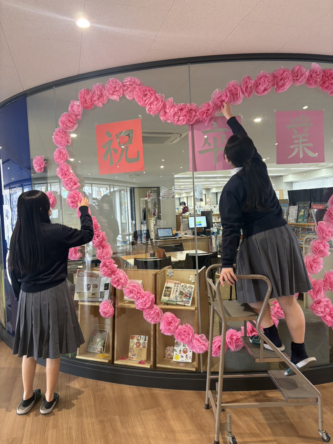 高校2年生の図書委員が、LRC(学校図書館)前に卒業生のためのフォトスポットを制作してくれました。「卒業生にとって思い出に残る一枚を」 そんな思いを込めて、昼休みの時間を使いながら、装飾やレイアウトを工夫し、心を込めて準備を進めてくれました。 LRC前は普段から多くの生徒が行き交う場所です。 その空間が、卒業という節目を祝う特別な場所へと変わりました。 主役は3年生ですが、 その門出を支えているのは、こうした後輩たちの温かな気持ちです。 学校行事は、当日の式典だけでなく、 そこに向けた一つひとつの準備や思いの積み重ねによってつくられています。