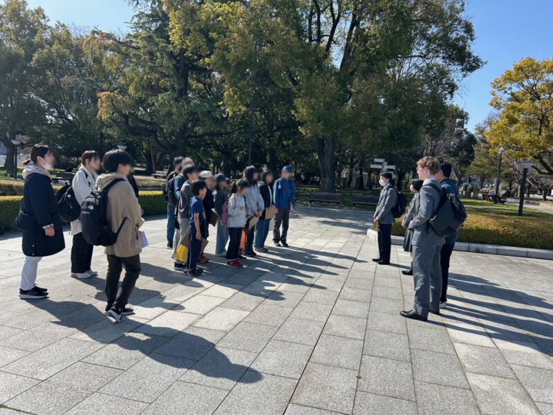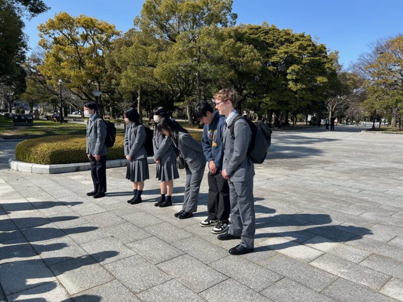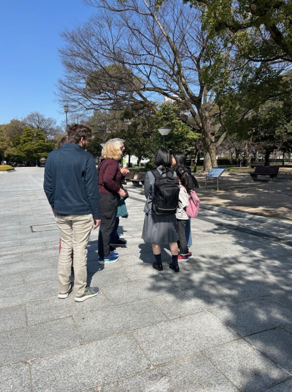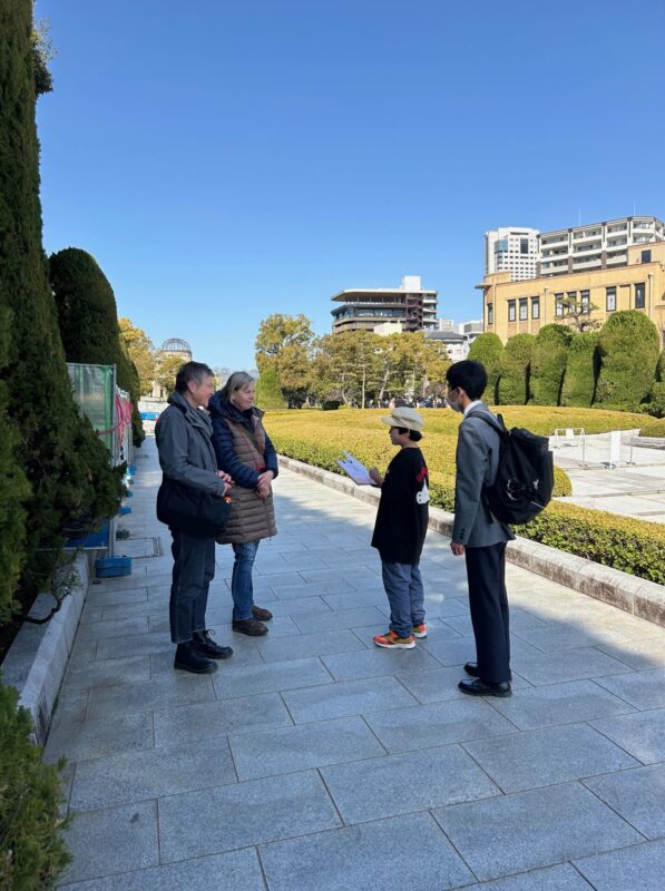 春のようにあたたかな3月5日(木)、不登校支援センター・パルクさんと合同の活動で平和公園を訪れてきました。パルクさんからは小・中学生約10名の生徒さんが参加。本校インターアクト部の中3から高2までの6名がグループリーダーとなり、一緒に外国の人にインタビューしていきます。本校留学生ジャックくんも参加。英語日本語の両面でフォローしてくれました。ドイツ、スロバキア、ブラジル、アメリカ、オーストラリア・・・世界各国から広島の街に平和を願い、訪れる人たちとの交流。「最初の声かけが難しいよね、勇気が要るよね」などとグループで話しながら、約一時間の活動があっという間に終了しました。一生懸命質問し、活動を楽しむパルクの小中学生さんの姿にこちらが勇気づけられた、本当に有意義なひとときとなりました。
