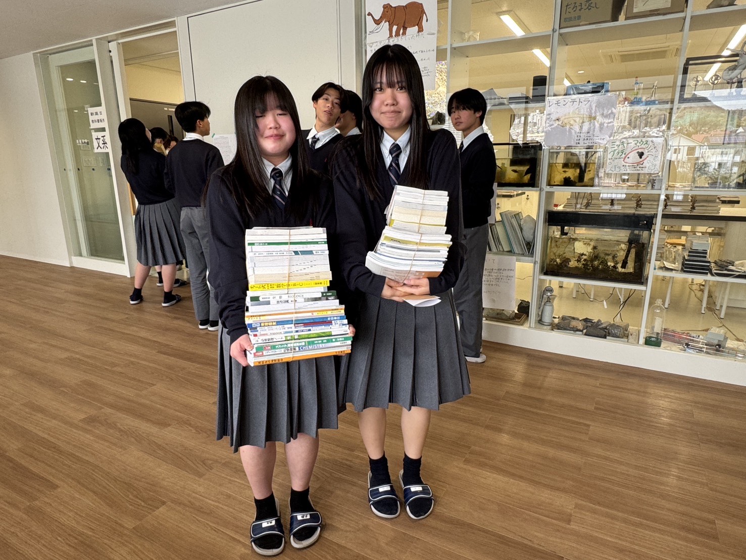3月の初週、高校生の教科書販売がありました。生徒たちは指定された場所で、教科書をまとめて受け取ります。両腕いっぱいに抱えるその姿は、毎年見られる光景ですが、やはり印象的です。冊数も多く、持ち上げた瞬間に思わず表情が変わる生徒もいました。