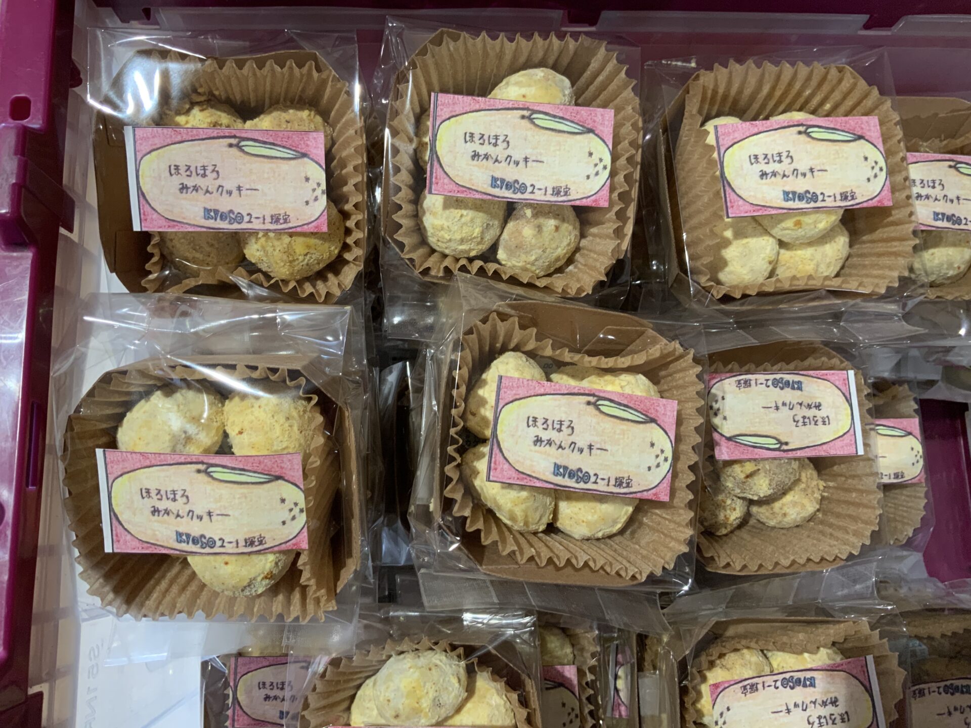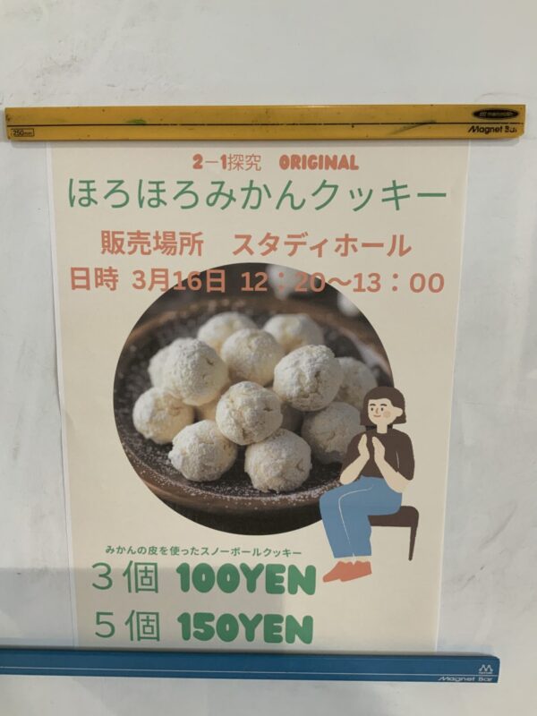 今日の昼休み、スタディホールで2年生が探究の授業で作った、「ほろほろみかんクッキー」の販売が行われました。
