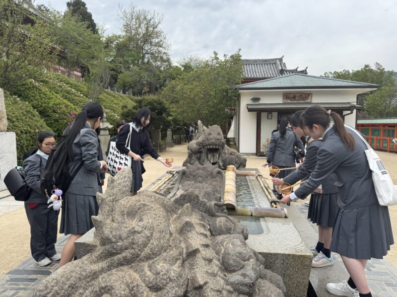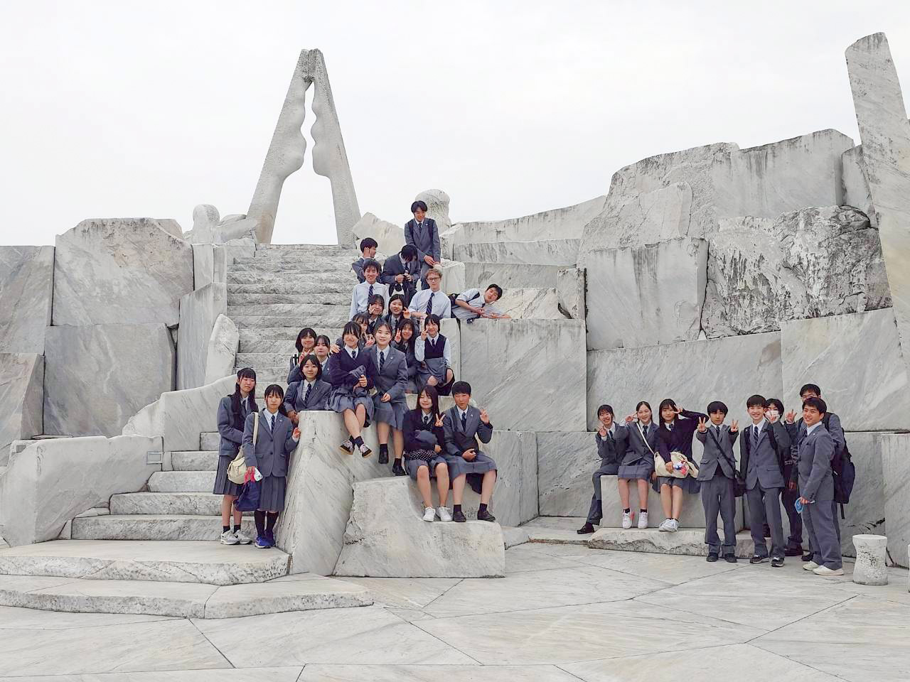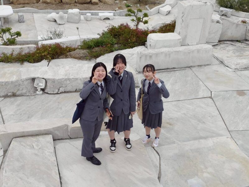 生口島に着いてからは、耕三寺前でクラス写真を撮ったあと、そのまま博物館に入館して平等院鳳凰堂を模した本堂をはじめとした15の建造物を見たり、その奥にある大理石を使った様々なモニュメントがある「未来心の丘」に行って異国情緒あふれる空間に体験していました。